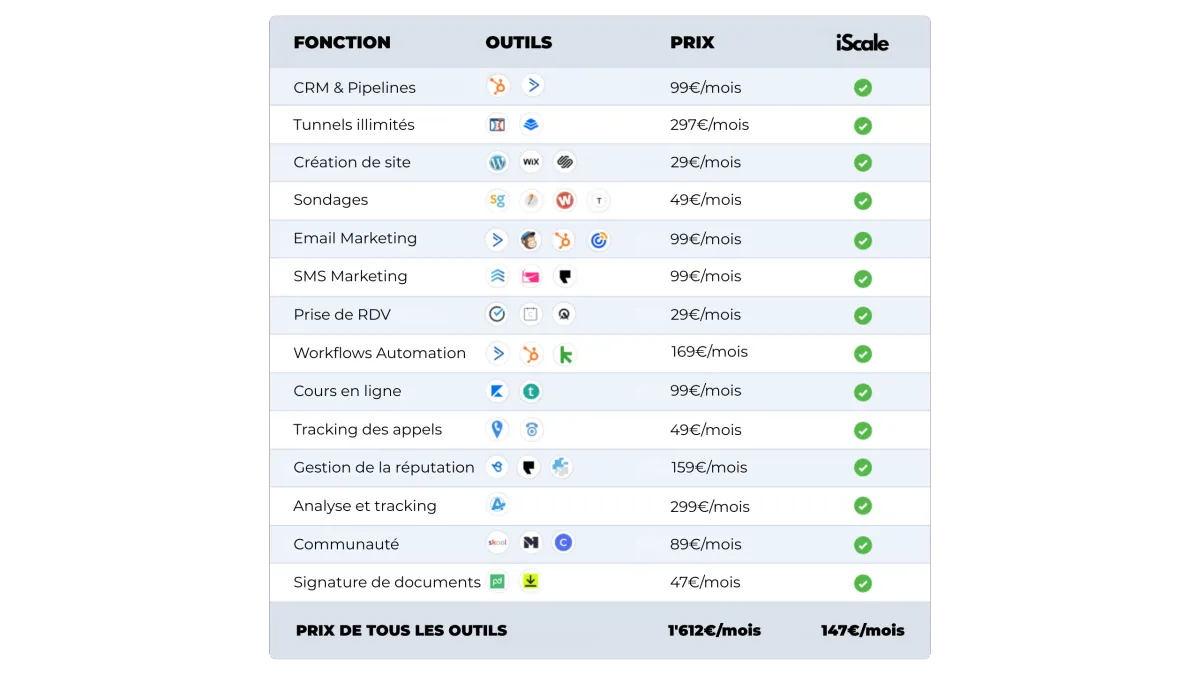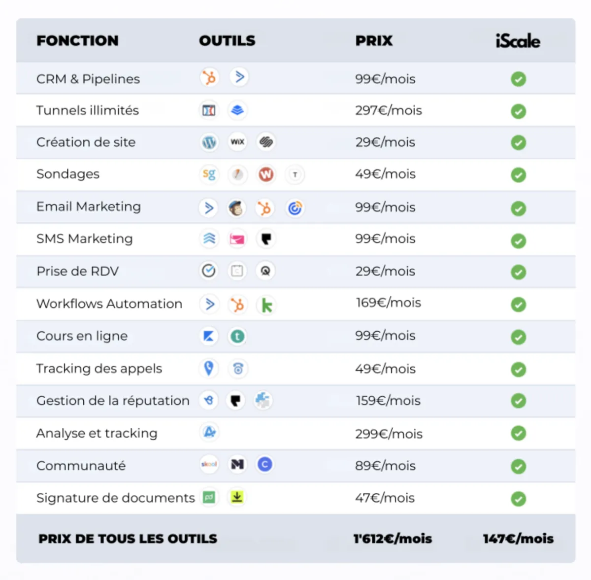 Économisez des centaines d’euros chaque mois en regroupant tous vos outils marketing au même endroit. Avec i-Scale, plus besoin de multiplier les abonnements : CRM, tunnels, emails, automatisations et bien plus encore, à partir de 50€/mois seulement (maximum 147€/mois pour le plan PRO)!